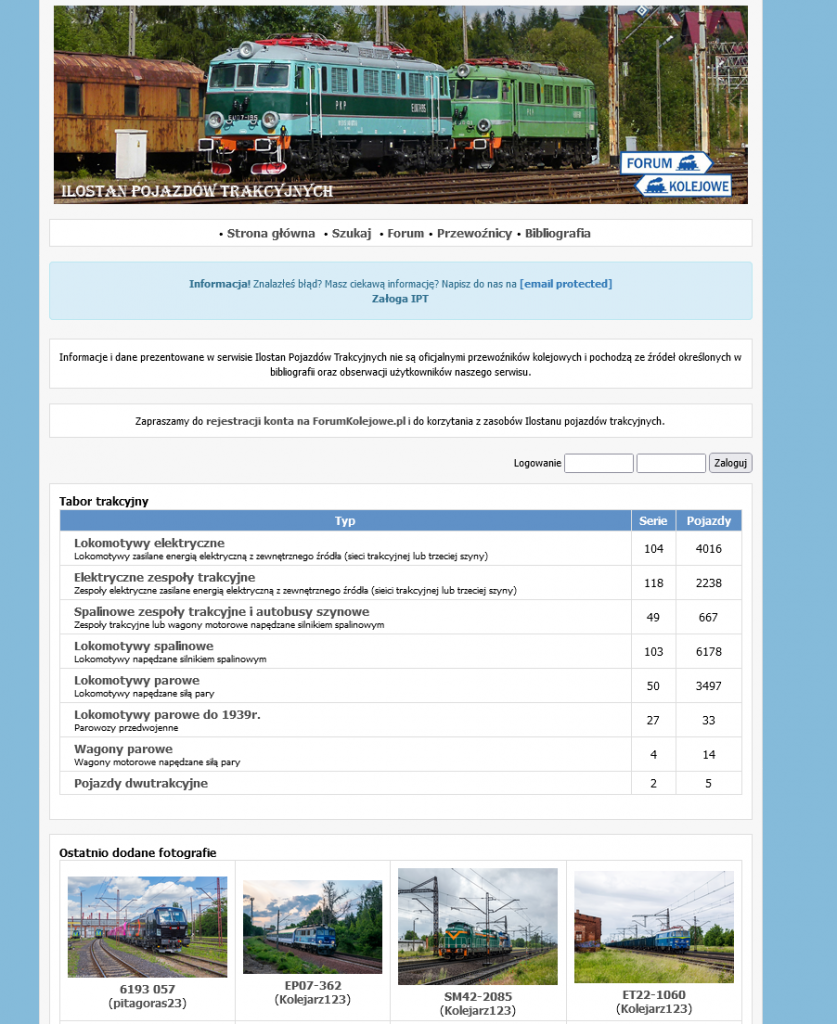 Projekt Ilostanu Pojazdów Trakcyjnych powstał z potrzeby uporządkowania olbrzymiej wiedzy, jaką posiadają polscy miłośnicy kolei w jednym miejscu – dla wygody nas, hobbystów oraz ludzi, którzy po prostu chcą zobaczyć, jaką historię ma pojazd, którym codziennie dojeżdżają do pracy lub szkoły.